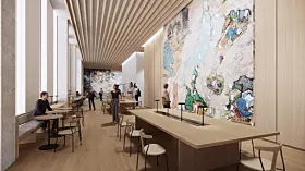 Else Marie Hagen, Elise Storsveen, Mari Slaattelid og Damien Ajavon skal produsere ny kunst til innvendige vegger i A-blokka (midten) og D-blokka (til høyre) på Einar Gerhardsens plass.Illustrasjon: Statsbygg / Team Urbis / Nordic Office of Architecture