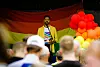 Noman Mubashir taler til de oppmøtte som hovedappellant under pridemarkering på Ellingsrud i fjor sommer.Foto: Bjørn Erik Hattrem