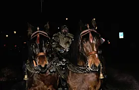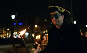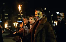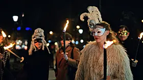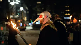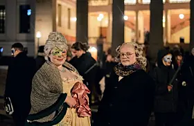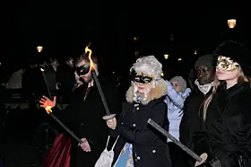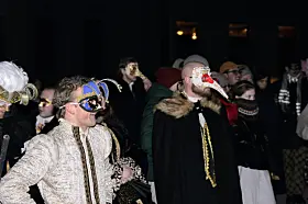 Maskert og i parade gikk det store følget gjennom sentrum. Ikke før midnatt kunne maskene falle.