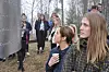 Ingen navn kommer først eller sist på minnemerket over de drepte. Linnea Svinndal (til h), Sara Aspaas Friling og medelever fra Ringerike folkehøyskole. Foto: Arnsten Linstad
