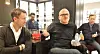 Oslo Arbeiderpartis Frode Jacobsen i midten. To generasjoner Follestad, William (t.v) og Bengt, lytter til hva han har å si. Foreløpig må den ansatte i baren nøye seg med å servere kaffe og pepperkaker. Foto: Anders Høilund