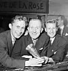 Hans Nordahl, i midten, med kongepokalen fra 1955 etter seieren over Lillestrøm i cupfinalen. Til venstre, Jan Erik Wold, og til høyre, Jack Farem. Foto: Riksarkivet/billedbladet Nå.
