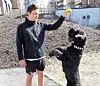 Hunden Kikki bor i Hans Nordahls gate. Hun vil gjerne vise fram noen balltriks. Her med kompis Aleksander Warvik. At gata de bor i er oppkalt etter en fotballspiller, det visste de ikke. Foto: Anders Høilund