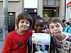 Popstjernene Marcus og Martinus er med på plantingen. Victor til venstre har skrevet på plakaten Maida holder. Maida er fadderbarnet til Linus (t.h) Foto: Anders Høilund