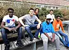 Hamza Yasin, (med skyggelue og våte bukser) sa under intervjuet på Ung Metro at tunge løft var greit for ham. Det har han bevist under sommerjobben på Nordpolen skole. Her tar arbeidslaget tjue sekunders hvile til ære for fotografen. Foto: Anders Høilund