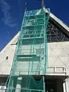 Murpuss og steinplater har falt ned fra fasaden på Torshov Kirke, og inngangspartiet er delvis tildekket for å beskytte besøkende. Foto: Anders Høilund