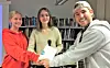 Leah Kristoffersen Larsen og Julia Sørgaard deler ut premien for beste pitch til The Ocean Bottles William Pearson