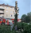 Treet fikk så store skader at brannvesenet fant det tryggest å hogge det ned. Foto: Henriette Sæbø
