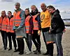 Miljøminister Ola Elvestuen, tidligere ruskengeneral Jan Hauger og Jenny Krohn sammen med noen av Ruskens samarbeidspartnere, Ås-jentene på strandrydding på Huk i mai 2019. Foto: Rusken
