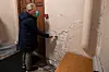 Selli plukker gammel murpuss fra en vegg i Fagerborg kirke.Foto: Olav Helland.