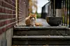 Katta tar det med ro på toppen av trappene inn til et sidebygg til Røa kirke. En rullestollampe ønskes, men Riksantikvaren og Byantikvaren er uenige om hva som er en akseptabel løsning. Så saken står i stampe.Foto: Olav Helland.