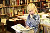 Lars Mørland (7) fordyper seg i tegneserier mens pappa titter i bokhyllene. Foto: André Kjernsli
