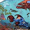 Livet under vann, med sjøgress, bobler, fisker og muslinger, er det du kan se på veggen. Bjørn-Hansen forteller at de fordeler oppgavene ut fra hva de synes er mest interessant. Austbø laget logoen, bobler, vann og koraller, mens Bjørn-Hansen sto for fiskene.