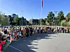 Foreldene stilte opp i en halvsirkel foran skolen. Femteklasse sang for de ferske nystarterne.