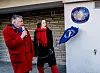 Kim Frieles blå skilt avduket av Anette Trettebergstuen utenfor blokka på Skøyenåsen