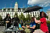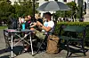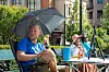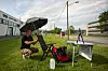 Det kommer stadig støttespillere innom Samuels stand foran Stortinget. Og støttespillerne deltar i samtaler om stort og smått på livestreamen. Mange ønsker å hjelpe til med alt fra å bære, skaffe ting som trengs eller bare holde paraplyen for å skjerme for den sterke solen.