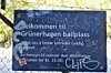 Et skilt ved inngangen til ballplassen slår fast at banen er stengt etter klokken 22. Dette respekteres i liten gard av brukerne. Foto: Christian Boger