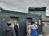 Kø utenfor det midlertidige toalettet på Operastranda.Foto: Petter Terning