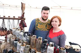 Natalia og Wojciech driver Medieval Merchant, og selger keramikk, vesker og annet utstyr laget på gamlemåten.Foto: Petter Terning