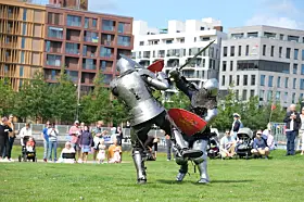 Bo (7) synes det var gøy å se ridderne kjempe: – De har veldig tungt utstyr!Foto: Petter Terning