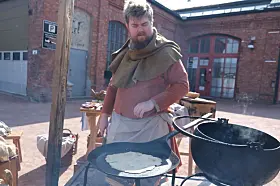 Her lager foreningen Kongshirden 1308 pannebrød på ekte middelaldersk vis.Foto: Petter Terning