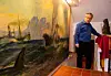 Pål Sagen skuer mot en hval som er i ferd med å bli fanget av hvalfangerskutene Nancy Gray og Duncan Gray på et kjempedigert maleri signert Thorolf Holmboe.Foto: Tomas Stasevicius