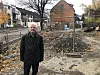 Einar Spurkeland foran tomten. Ved siden av det røde mursteinshuset i bakgrunnen er de nye boligene planlagt, hvor almetreet (det store treet uten løv) Spurkeland omtaler som "et ikon for gaten" må fjernes for å få plass. Lohrbauers villa ligger til høyre for bildet, mens vi ser Sagveien på venstre side.Foto: Torkil Kristiansen