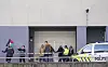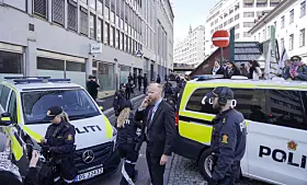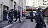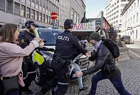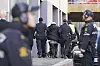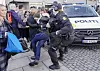 Stortingspresident Masud Gharahkhani føres inn i Folkets Hus via bakveien. Rundt 50 aktivister samlet seg for å blokkere landsstyremøtet til Arbeiderpartiet på Folkets Hus.