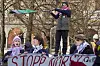 En drøy time etter planen inntok Jonas Gahr Støre talerstolen, hvor han gikk utenfor manuset sitt for å henvende seg til demonstrantene som hadde hindret ham og de andre politikerne i å komme inn.