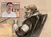 Terrorsiktede Arfan Bhatti da han vitnet under straffesaken mot Zaniar Matapour i Oslo tingrett. Advokat Elden (innfelt) avviser at han ga klienten Bhatti noen anbefaling om at han skulle holde seg unna Norge etter 25. juni-angrepet.Tegning: Ane Hem / NTB. Foto: Frederik Ringnes / NTB