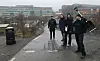Frontfigurene i "Ja til stor park i Nydalen" klar med spade foran tomta i Sandakerveien 113-119. I bakgrunnen BIs bygg, og til høyre for det, Schibsted-trykkeriet og tomta som Obos nå eier i Sandakerveien 121. Fra h. Gosha Szewczyk, Caroline Frøyland, Torger Kjeldstad og Peter Kolstad.Foto: Paul Torvik Nilsen