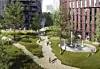 Avantors illustrasjon av boliger og et mindre parkanlegg i Sandakerveien 113-119. — Skissene er fra 2017 og den offentlige høringen, og ble presentert i 2019, sier prosjektleder Ola Thon i Avantor.Illustrasjon: Cobe Arkitekter