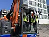 Byråd Hermstad får en ABC i å bruke den elektriske gravemaskinenFoto: Bymiljøetaten