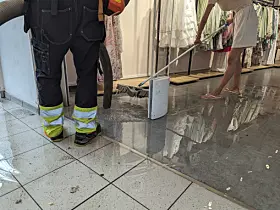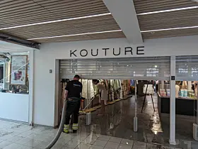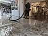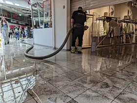 En stor tankbil med påkoblet pumpe fra tilkalt personell i tillegg til butikkansatte utstyrt med mopp prøvde da VårtOslo var innom mandag ettermiddag etter beste evne å få bukt med vannmengdene som hadde spredd seg over store deler av kjøpesenterets første etasje under styrtregnet kort tid før.