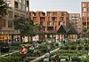 Illustrasjonsbilde av boligprosjektet (som heter 9.4), med parsellhager og felleshus i midten. Illustrasjon: Dyrvik Arkitekter / Transborder Studio / OBOS