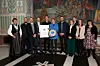 Kulturhuset-vinnerne viser frem diplom og plakett i rådhuset i dag. Fra venstre: ordfører Marianne Borgen, Runar S. Eggesvik, Kulturhuset, Jarle Jensen, Kulturhuset, Jeppe Sandov, Kulturhuset, Frode Jacobsen, Kulturhuset, Mari Smørgrav, Tuvalu arkitekter, Stian Kolsrud som representerer Olav Thon, Anette Kjelland-Apold, Tuvalu arkitekter, Alexander Funk, NP Bygg, Camilla N. Waldal, Tuvalu arkitekter, Victoria Marie Evensen, leder i byutviklingskomiteen. Foto: Oslo kommune / Sturlason