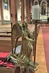 Knelende engel, av Emanuel Vigeland, møter kirkegjerne i døra. Foto: Kjersti Opstad