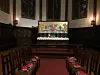 Over gitteret henger det trefigurer av Jesus mor, Maria, Jesus selv på korset og disippelen Johannes. Øverst ser vi engler som kneler foren en praktfull tom stol. Den er tom fordi gud selv er usynlig og slik ikke kan bli avbildet som menneske på en trone.
