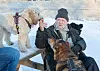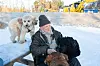 Arne Jørvåg er hundejordets mest omsvermede mann. Hundene elsker mannen på benken. Han har nemlig godbiter med seg.Foto: Elvina Vladi Kvisne