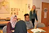 Daglig leder i KIA velferd, Merete Hallen, i klasserommet sammen med Bahar Ahmed (til v.), Mahelet Ayele og Sadia Abdi (med ryggen mot kamera). Foto: Arnsten Linstad