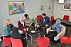 I "Pusterommet" hos KIA i Ebells gate. Fra venstre Sadia Abdi (ryggen mot kamera), Merete Hallen, Bahar Ahmed, Mahelet Ayele, Espen Andreas Hasle (KrF) og Mayada Moussa. Foto: Arnsten Linstad