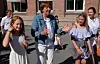 Elevrådsrepresentantene Mille Scharning Lund (t.v) og Filippa Martinsen Rognen (t.h) viser ordfører Marianne Borgen og BU-leder Anne Christine Kroepelien rundt i skolegården på Bolteløkka skole. I bakgrunnen rektor Ronny Sollien Engebråten. Foto: Christian Boger