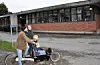 Håvard Lorentzen (på sykkel), Elise og Virva i lasteplanet og Magnus Buflod foran velferdsbygget ved Veterinærhøyskolen. Bolteløkka-foreldrene mener bygget kan brukes som skolebygg sammen med paviljongløsningen i Thulstrups gate. Foto: Arnsten Linstad