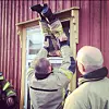 Ingen skal si at Oslos brannfolk ikke er kreative når de hjelper byens innbyggere. Slik tok brannfolkene seg inn i det tomme trehuset på Kampen da røykvarsleren slo ut. Foto: Oslo brann- og redningsetat