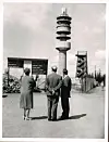 Bildet av Tryvannstårnet under bygging i 1961 er tatt av en ukjent forograf. Til høyre ser man tårnet som ble revet da dagens tårn sto ferdig året etter.