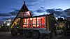 Lastebil som et slags naust på Langkaia på vestsiden av Bjørvika. Her ligger vinterlandsbyen SALT med konsertområde som har plass til 5.500 personer. I tillegg finner du blant annet sauna, langhus og flere kunstinstallasjoner. Foto: Salt Art & Music/Erlend Lohne