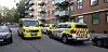 Fem politipatruljer og to ambulanser rykket ut til øvre del av Christies gate etter at en person på fortauet skal ha blitt skutt på fra en balkong. Foto: Christian Boger