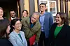 Lan Marie Berg (MDG), Raymond Johansen (Ap), Einar Wilhelmsen (MDG) og Hanna E. Marcussen (til h.) utenfor Mangelsgården i Storgata. Foto: Morten Lauveng Jørgensen