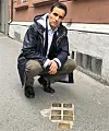 Yassine Arakia (H) ved de jødiske snublesteinene i Calmeyers gate i Oslo. Foto: Privat