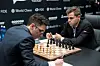 Regjerende verdensmester i sjakk Magnus Carlsen og utfordrer Fabiano Caruana under sjakk-VM i London i 2018. Foto: Terje Bendiksby / NTB scanpix